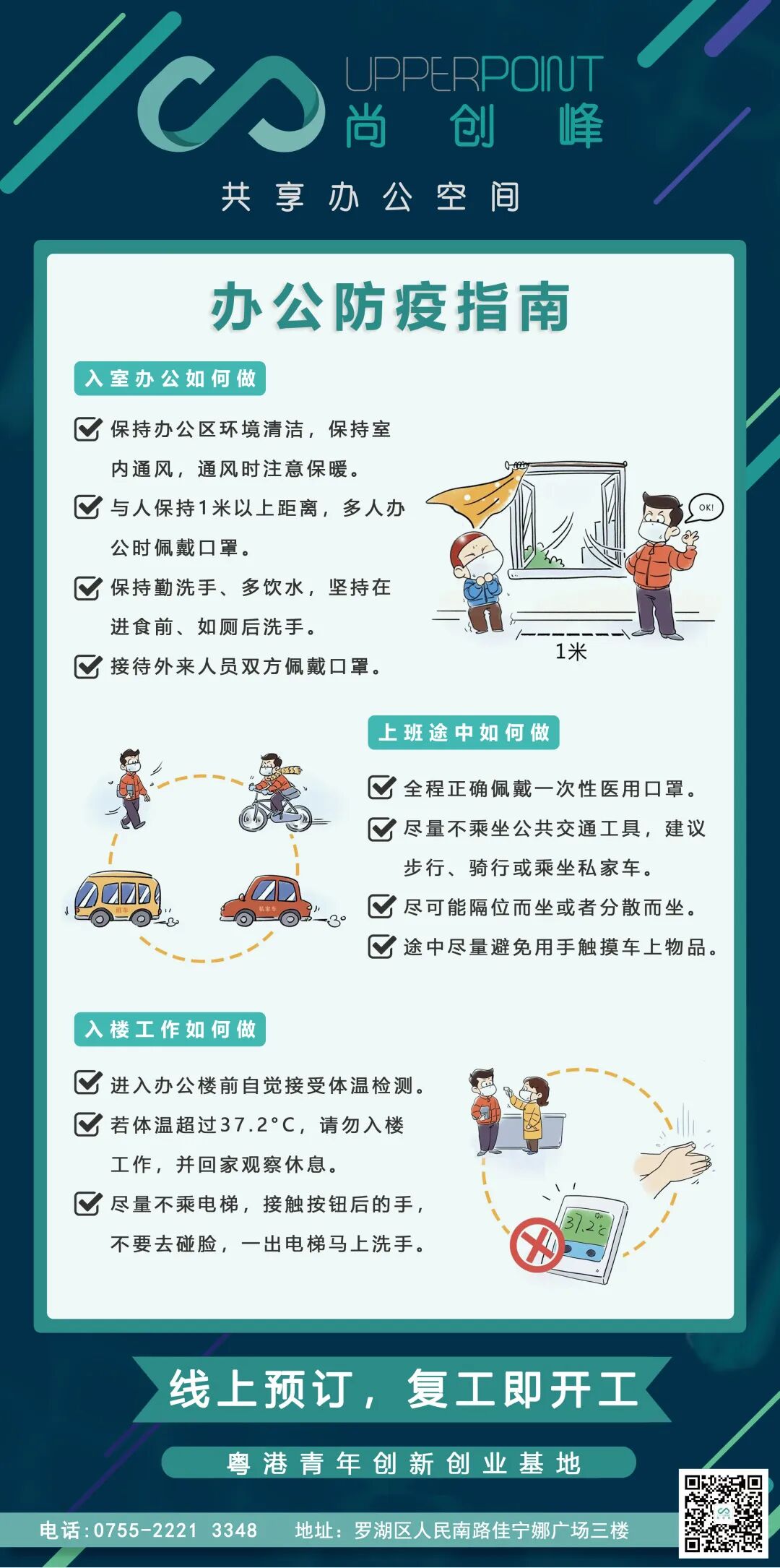 自疫情防控以来,尚创峰Upper Point 从空间环境管理、人员控制、物资储备、防疫宣贯等关键环节全面实施防控举措,共同为创造安全安心的办公环境竭尽全力。