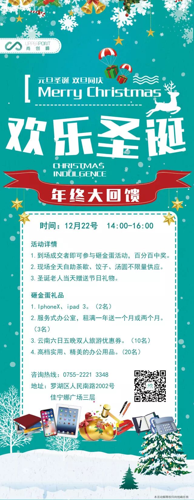 您好!首先预祝大家圣诞节快乐!借此圣诞佳节来临之际,尚创峰实业(深圳)有限公司诚挚地邀请您参加12月22日14时,在佳宁娜广场3楼举行的“欢乐圣诞,年终大回馈”活动。本次活动中,我们推出了诸多好礼、特价优惠以及精美茶歇,以回报广大客户与伙伴们长久以来的支持与帮助。