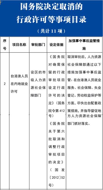 近日,根据国务院印发《关于取消一批行政许可等事项的决定》,决定取消11项行政许可,其中包括—台港澳人员在内地就业许可,取消台港澳人员在内地就业许可审批后,人力资源社会保障部将在台港澳人员就业服务、社会保障、失业登记、劳动权益保护等方面,尽快出台配套政策措施,并指导督促地方人力资源社会保障部门抓好落实。该项举措将打破台港澳人员在内地创业、就业的隐形“玻璃门”,加强港澳台与内地的融合。