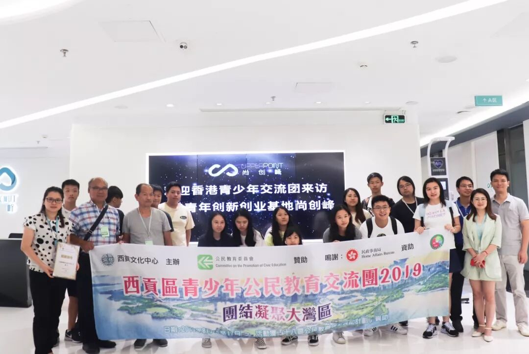 8月17日,在香港西贡文化中心组织及市委统战部领导的带领下,香港西贡区青少年公民教育交流团一行20余人来访粤港青年创新创业基地尚创峰,对基地的运营模式和香港青年入驻情况及政策补贴等进行了详细的了解。